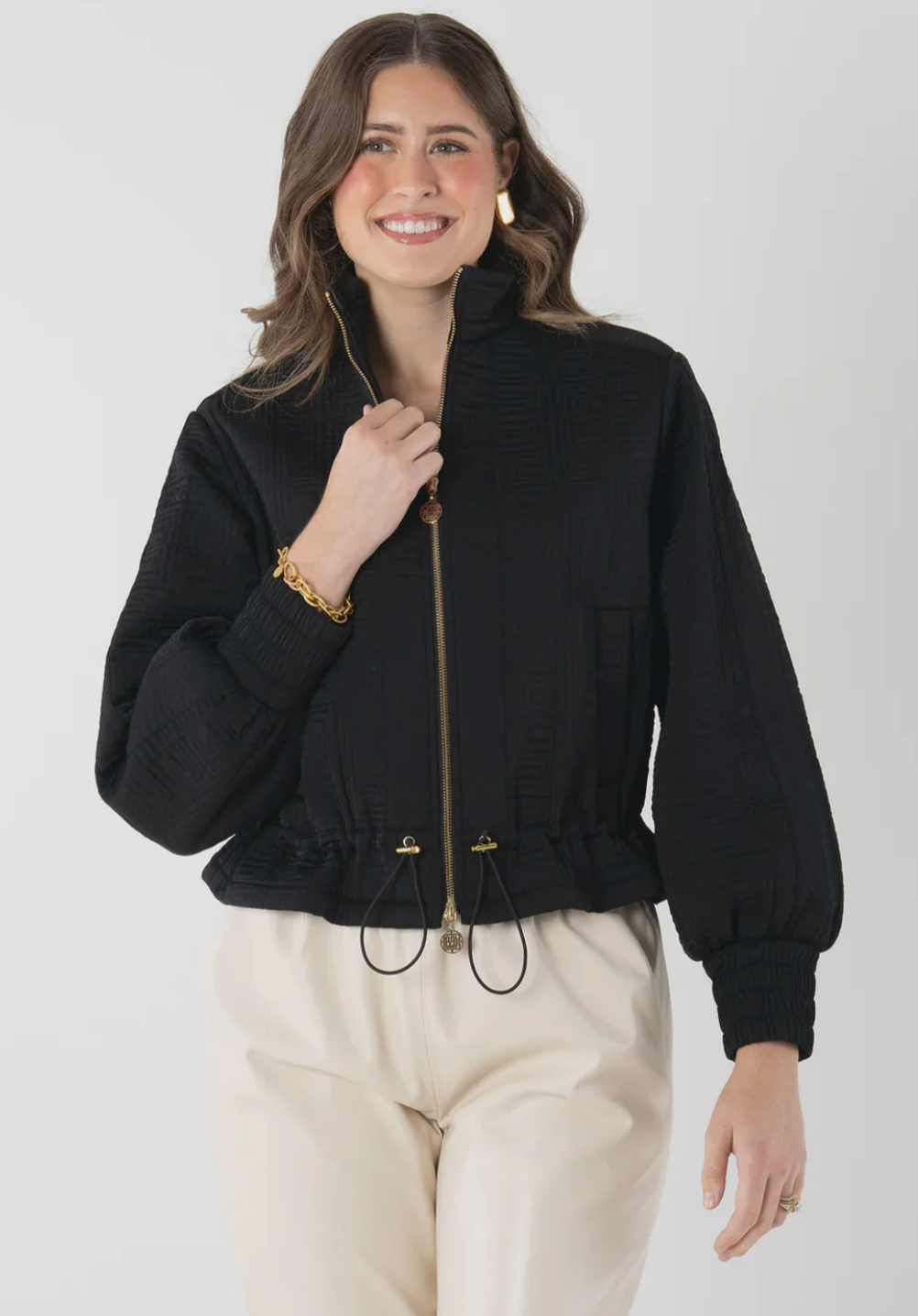 This jacket features a classic stand collar and subtle blouson sleeves that add effortless volume and movement.