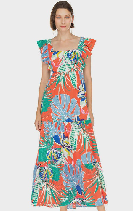 Jade Bold Blossom Ruffle Sleeve V-Neck Dress
