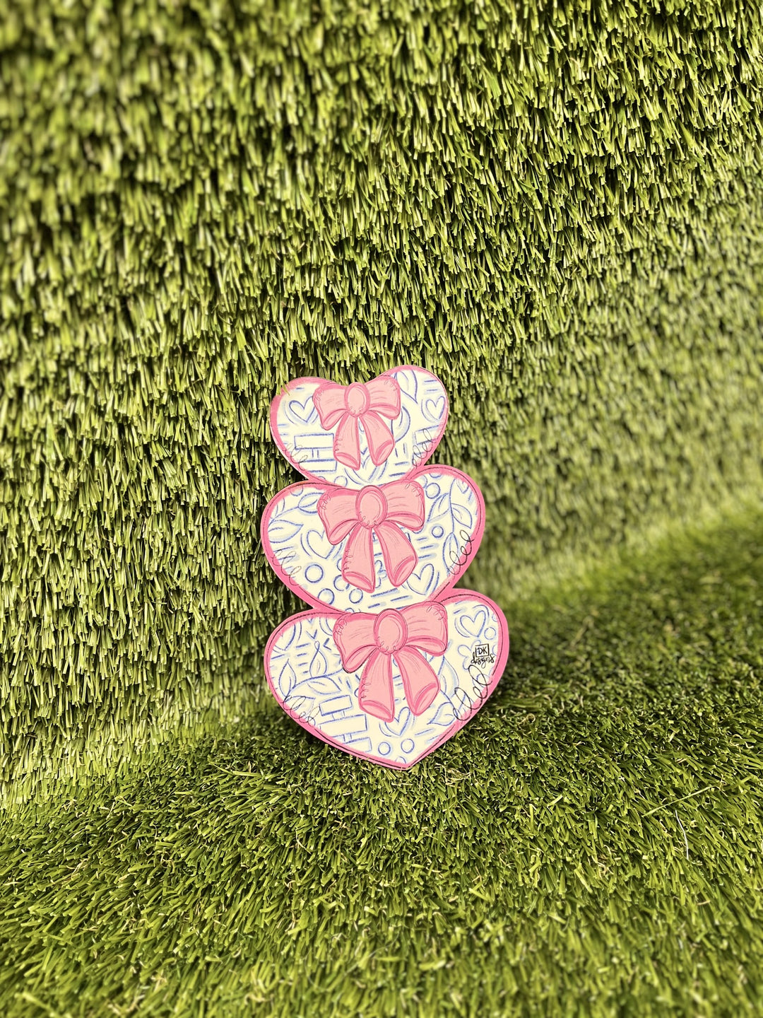 DK Designs Three Stacked Blue and White Hearts with Bows