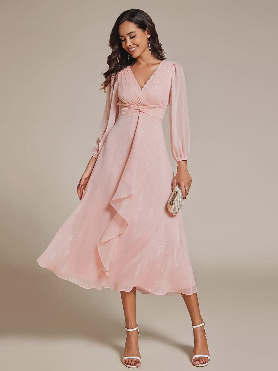 Pink Shiny Chiffon Wedding Guest Dress with Long Sleeve