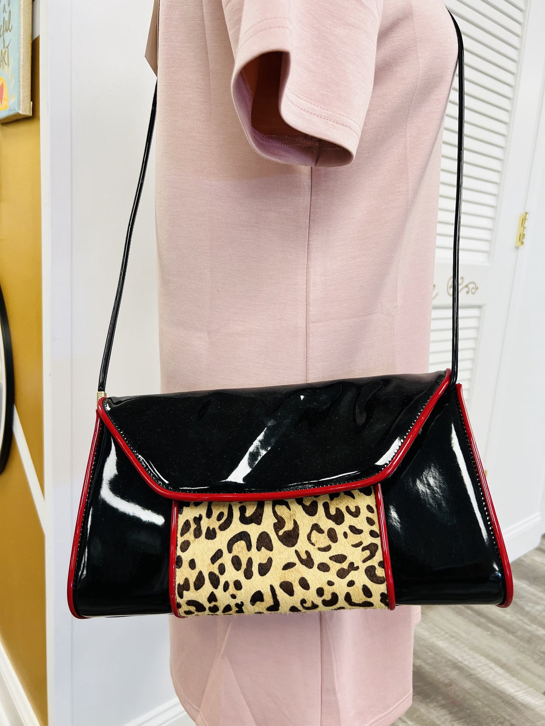 Black Shiny Cheetah Purse With Red Detail