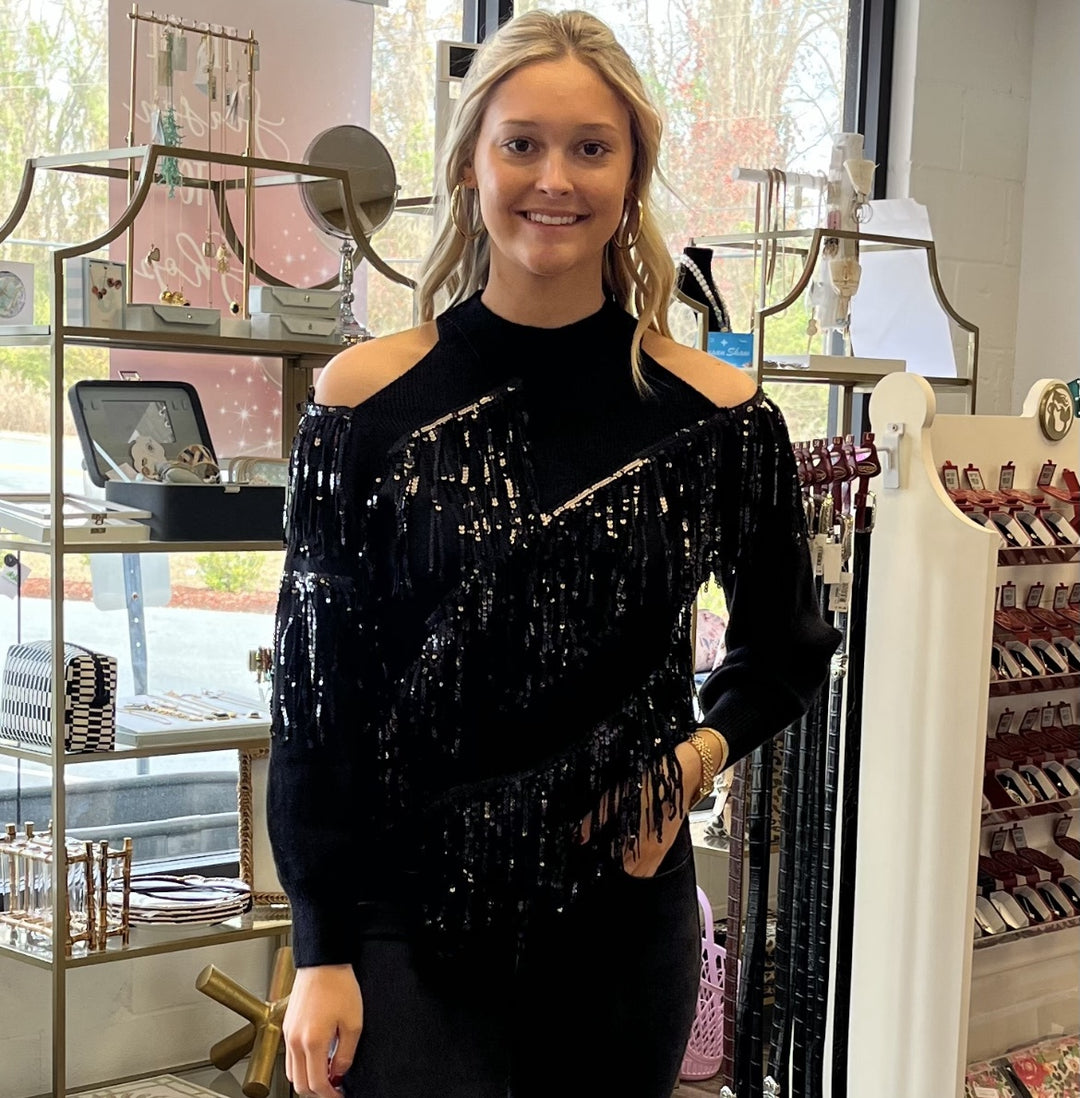 Black Sequin Fringe Trimmed Cold Shoulder Sweater