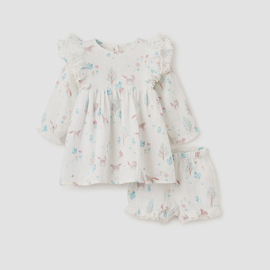 Elegant Baby Pony Meadow Organic Muslin Dress & Bloomer Set