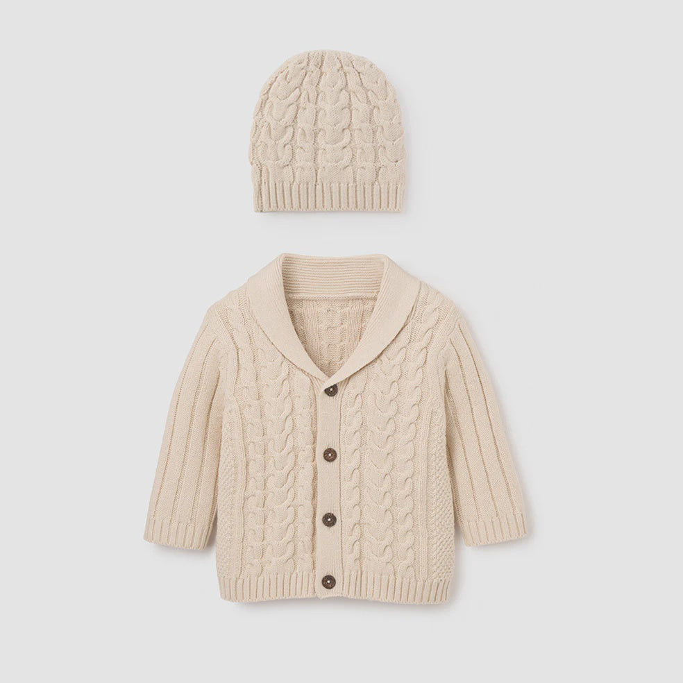 Elegant Baby Rainy Day Horseshoe Cable Knit Cardigan and Hat Baby Boxed Gift Set