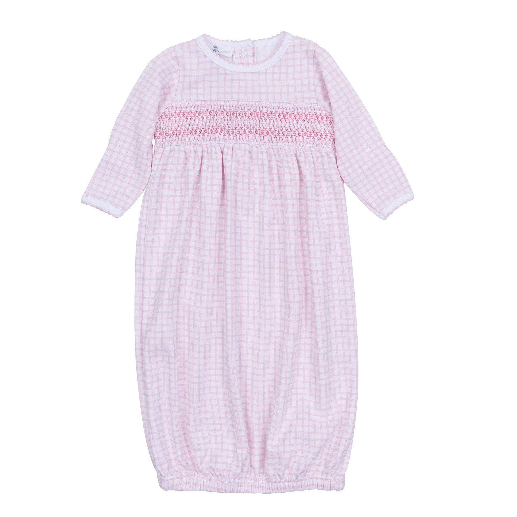 Introducing hand-smocked elegance with our Peek-A-Boo Wishes Smocked Gathered Gown in pink, crafted from the most luxurious Pima cotton. This adorable gown features charming hand-smocked detail, delicate pink picot trim, and a sweet check pattern, perfect for spending quality time with family, visiting loved ones, a delightful first adventure at the park, offering a touch of traditional beauty, providing a comfortable and gentle fit for newborns, a sweet and cherished addition to baby's layette.