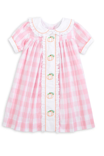 Posh Pickle Proper Pumpkins Pink Gingham A-Line Dress with Pumpkin Embroidery