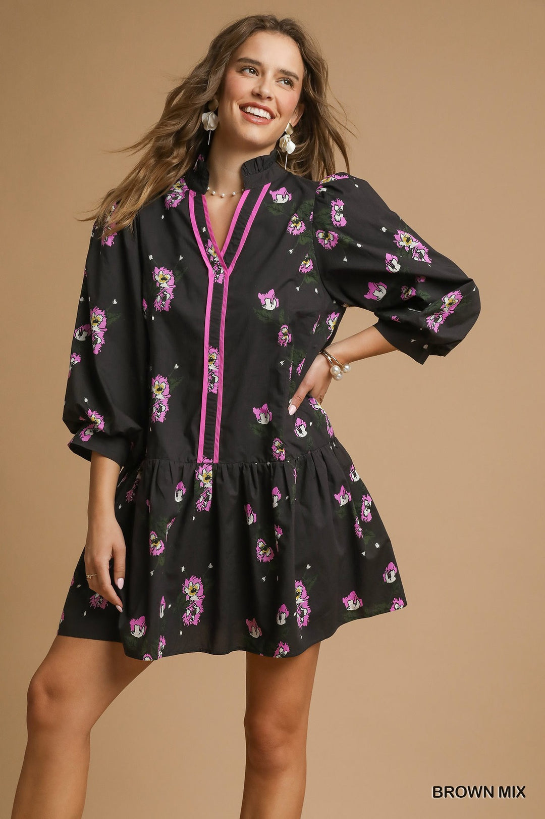 Umgee Brown Mix Floral Mini Dress with Puff Sleeves