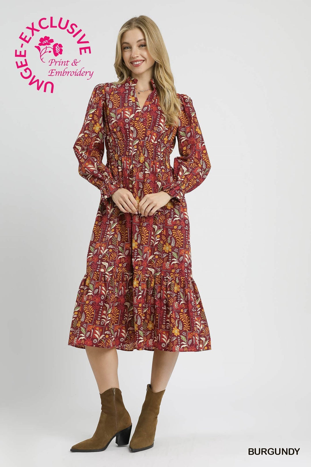 Umgee Floral Midi Dress with Smocked Waist- Burgundy Mix