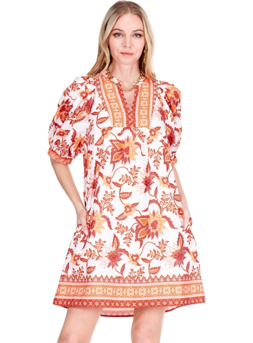 Umgee Cream Mix Floral Puff Sleeve Mini Dress