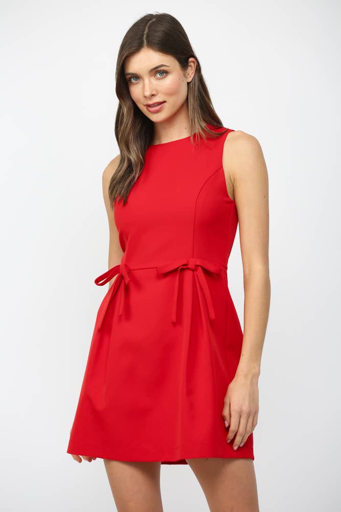 BOW TIE WAIST DETAIL SLVL DRESS S:97%POLY 3%SPAN / L:100%POLY MODEL HEIGHT: 5’9.5”