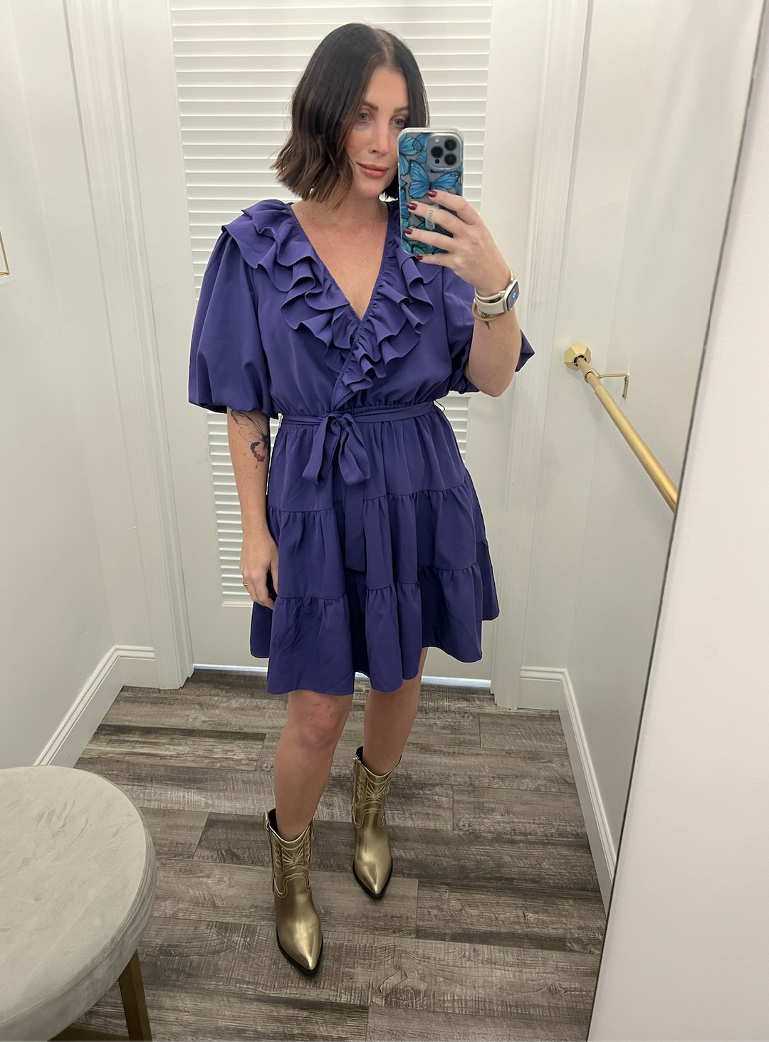Joy Joy Purple Ruff Faux Wrap Tier Dress
