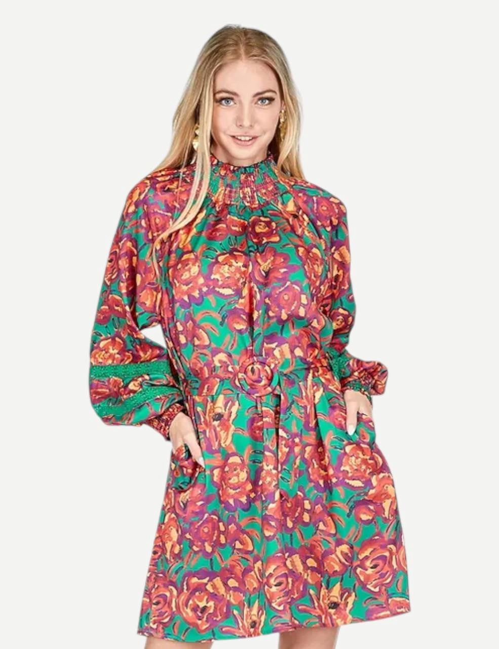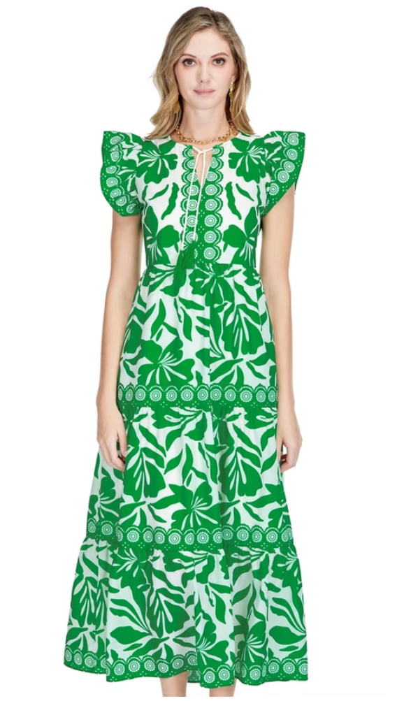 Jade Bold Blossom Ruffle Sleeve V-Neck Dress