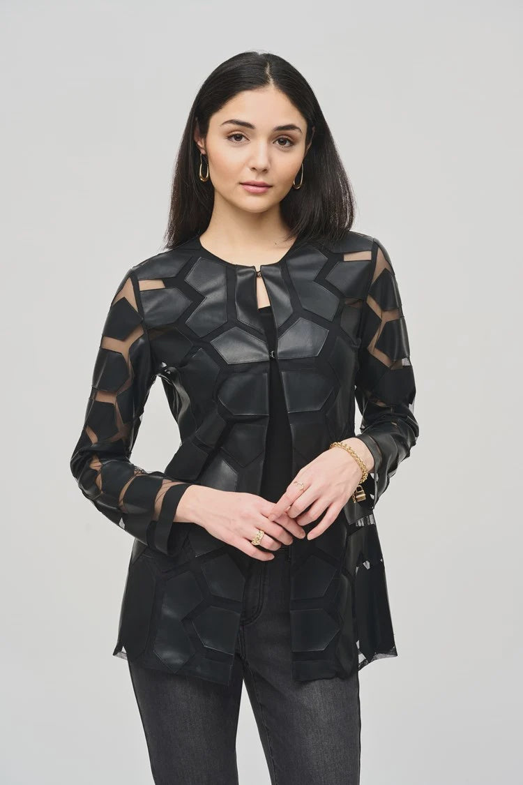 Joseph Ribkoff Black Laser-Cut Leatherette on Mesh Jacket