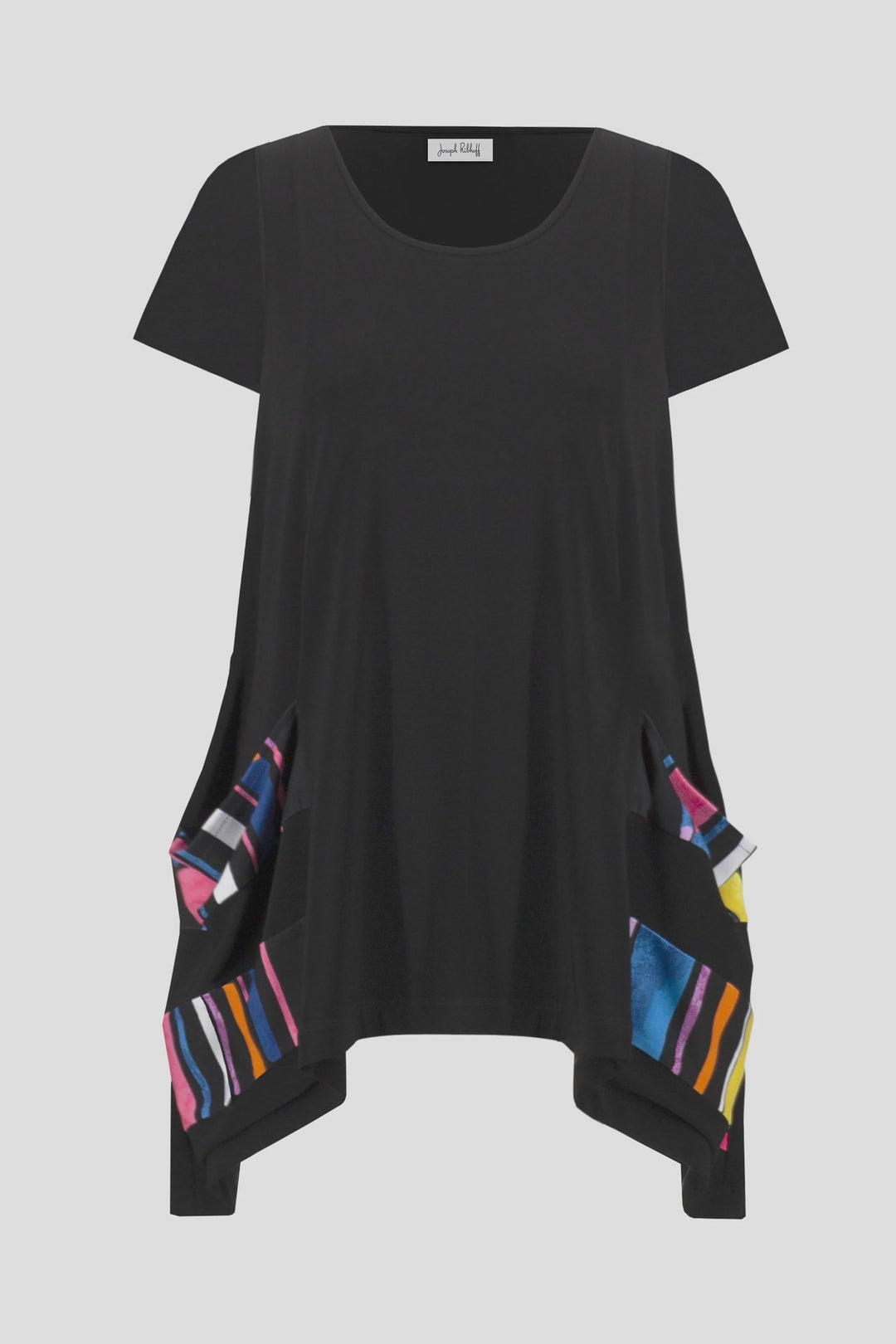 Joseph Ribkoff Silky Knit Stripe Print Handkerchief Tunic- Black/Multi