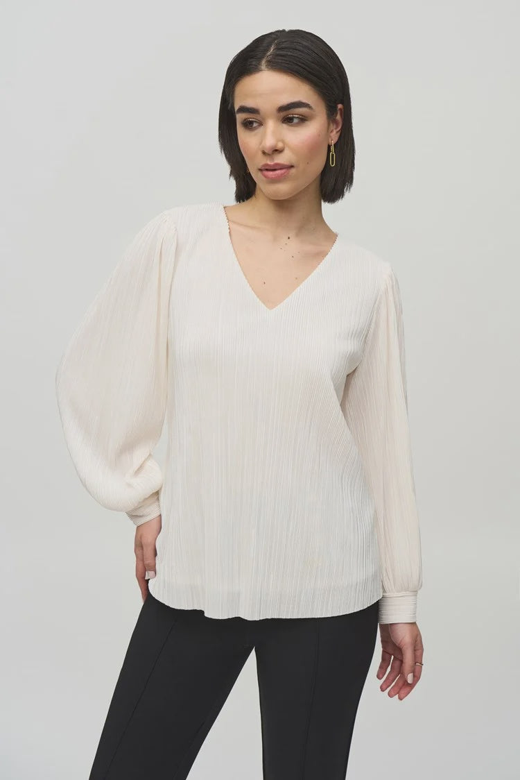 Joseph Ribkoff Off-White Pleated Knit Boxy V-Neck Top