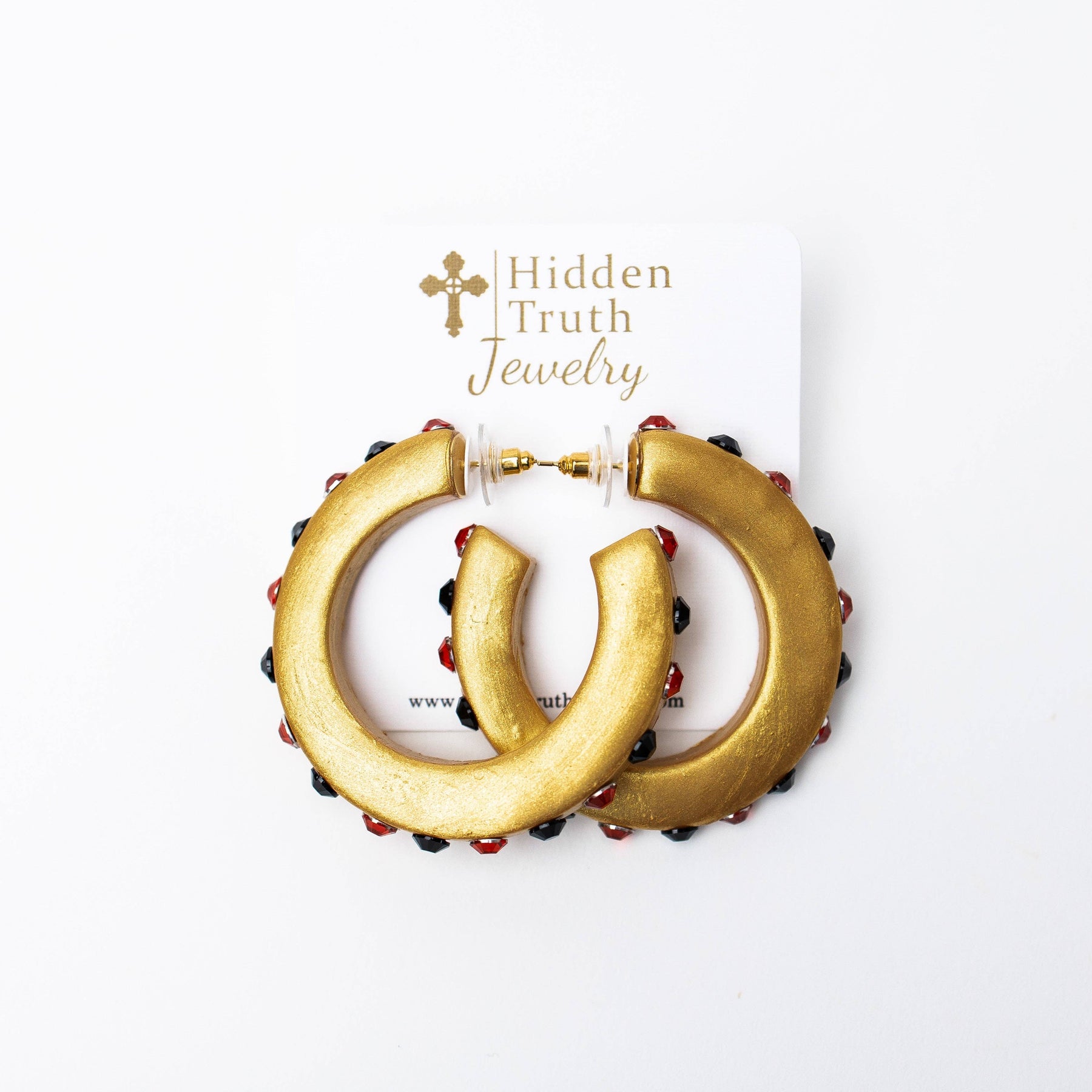 Red and Black Hoop Earrings Scripture on the back: Philippians 4:13, "I can do all things thru Christ." Fun, lightweight and fills you with joy describe these beautiful golden hoops! Wear them day to night and hold the truth that brings great joy near to your heart & mind. Be reminded that it's God's strength not yours that sustains you and helps you overcome any and every situation! Hidden Truth earrings are nickel free & hypoallergenic.