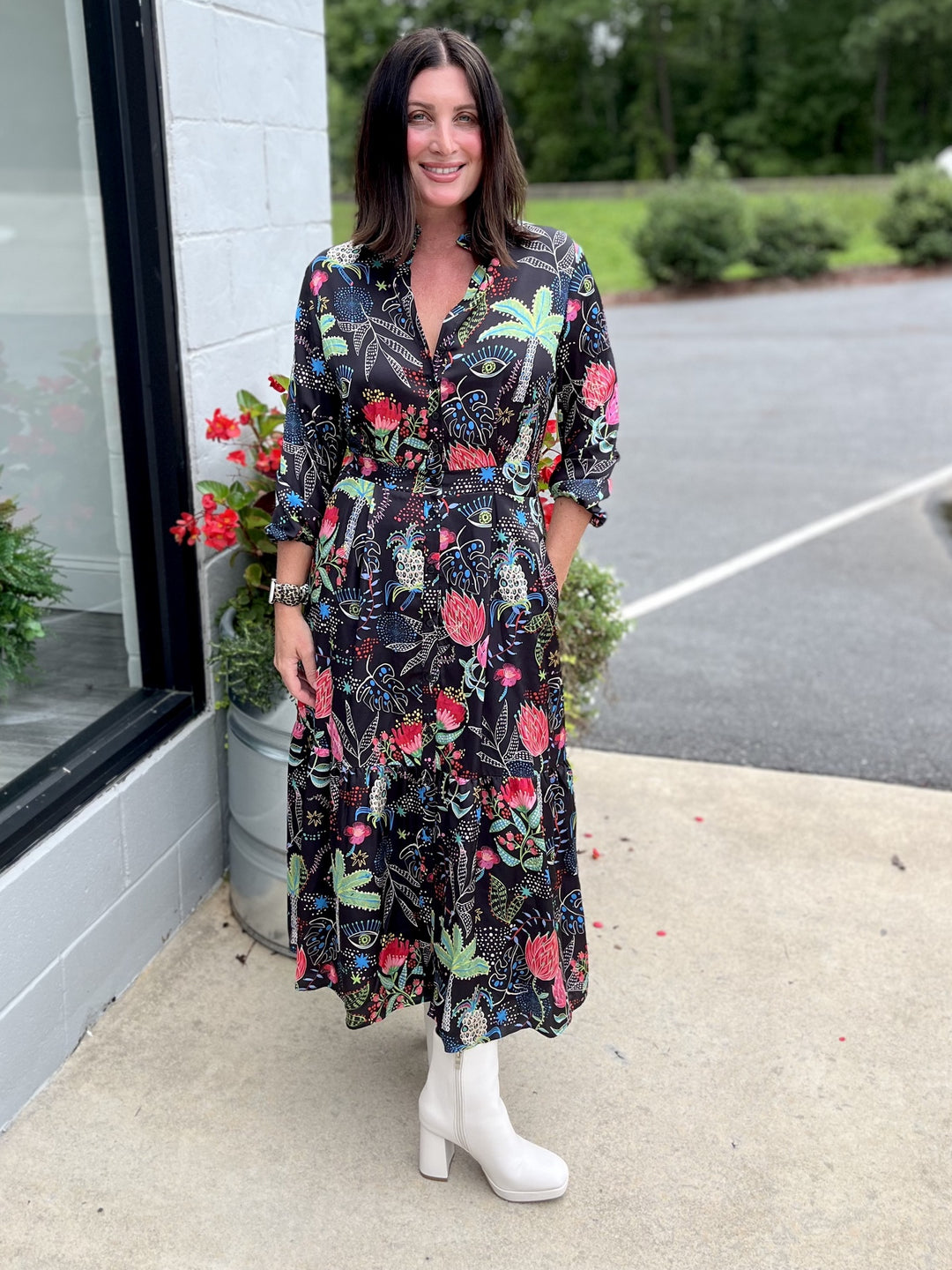 Umgee Black Mix Floral Print Dress with Scalloped Neckline