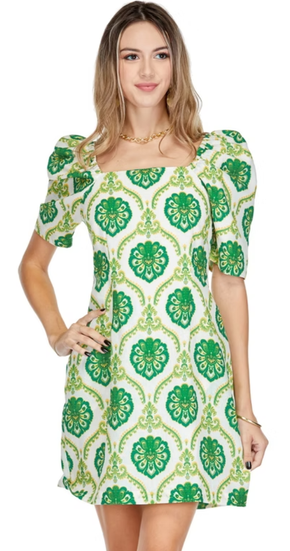 Joy Joy Green Motif Puff Sleeve Fitted Dress