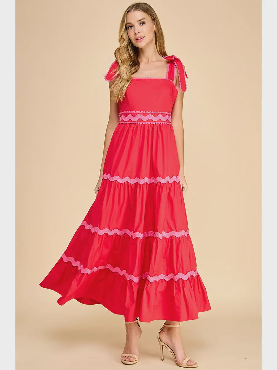 Red Ricrac Detail Back Hidden Zipper Tank Midi Dress