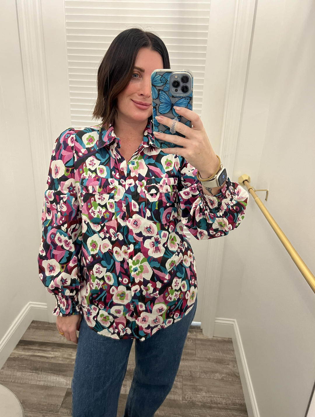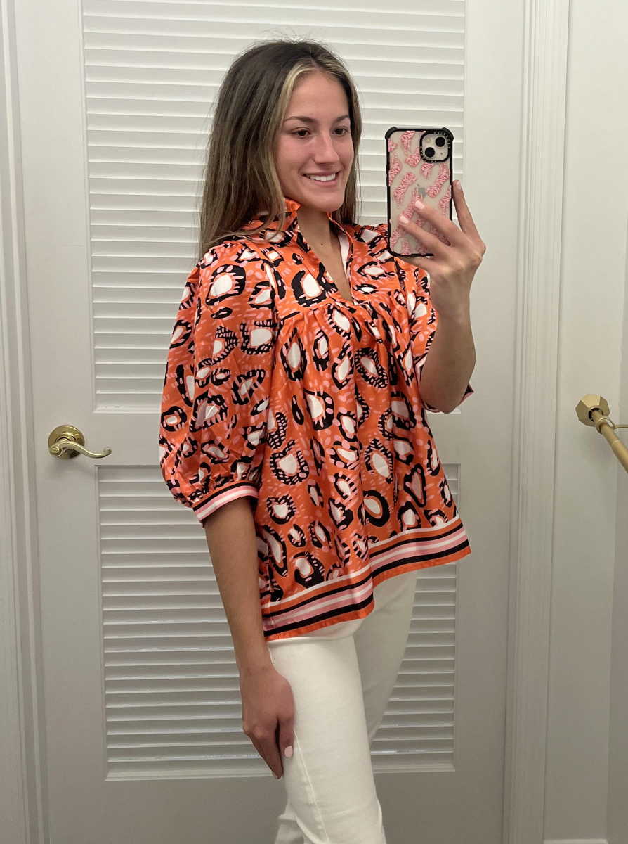 Jade High Neck Puff Sleeve Top-Abstract Border- Medium Only