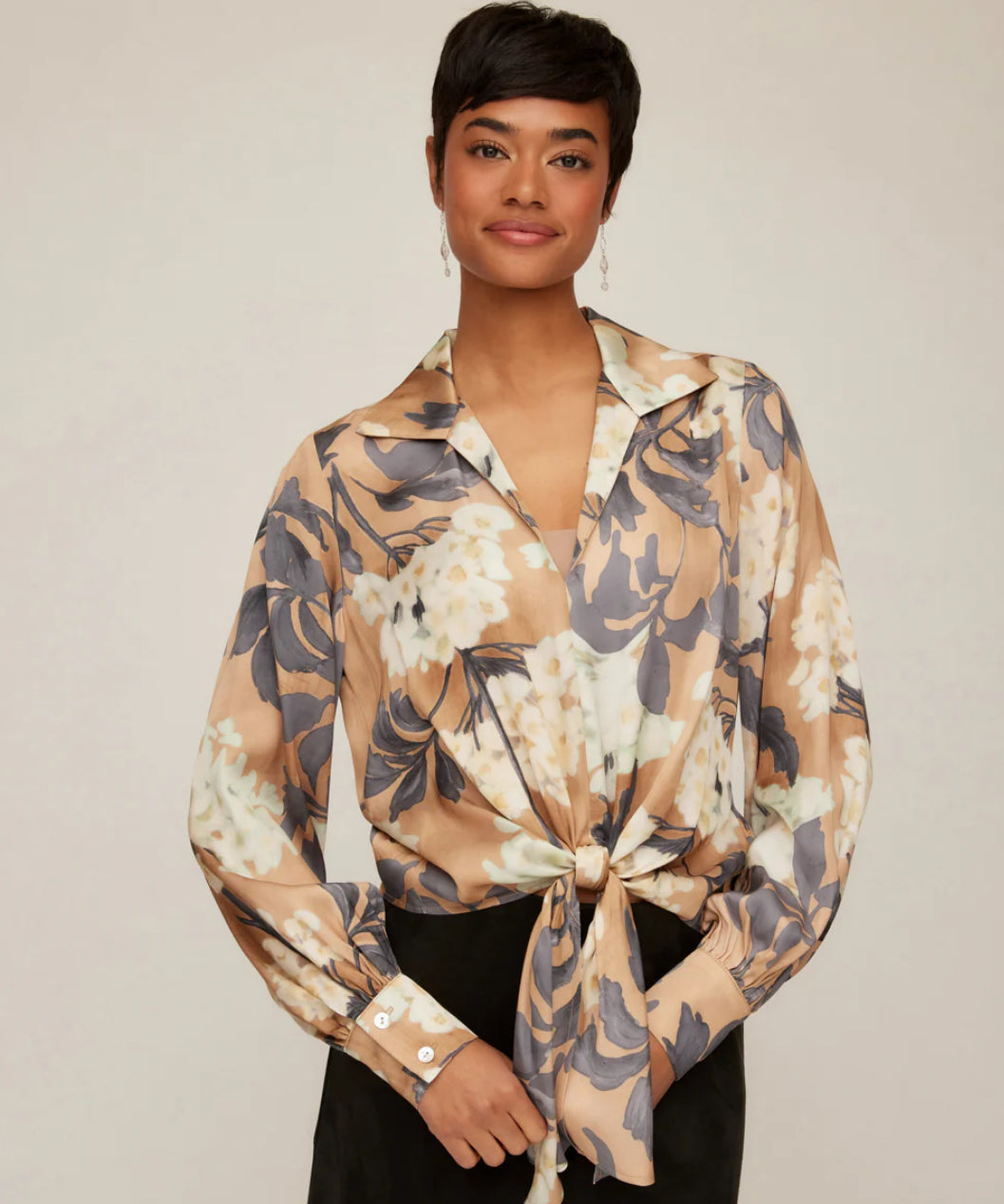 Crafted in a luxurious Hydrangea Satin Floral Print, this blouse showcases a soft, lustrous finish with an elegant floral design. A collared neckline adds classic polish, while the long blouson sleeves with shell button cuffs bring a refined touch. The tie-front detail creates a flattering silhouette, making it versatile for both day and evening wear.