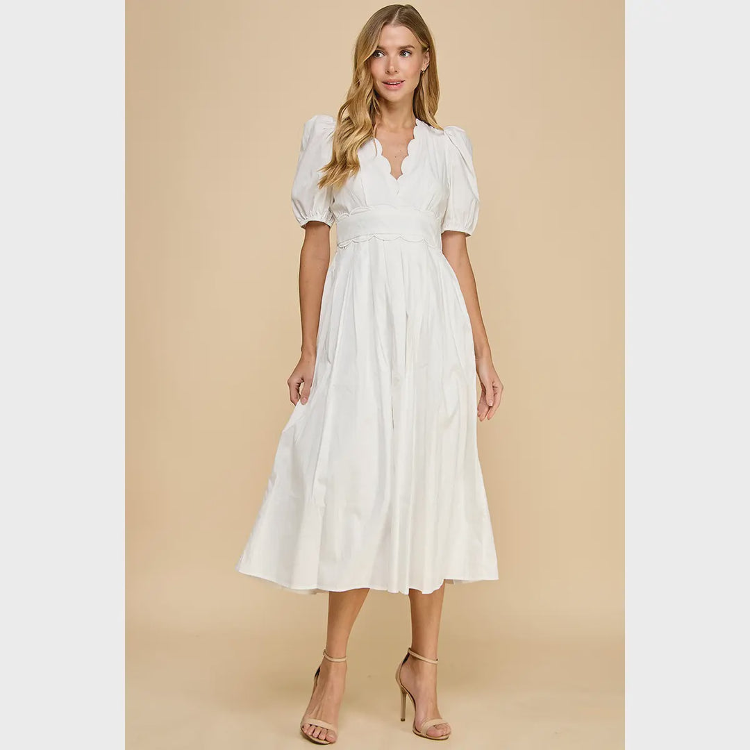 TCEC Neckline Scalloped Detail Midi Dress- White