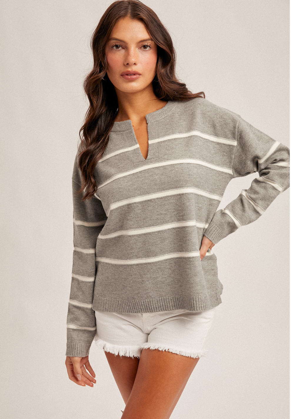 Hem & Thread Heathered Gray/White Stripe V-Neck Sweater Knit Top