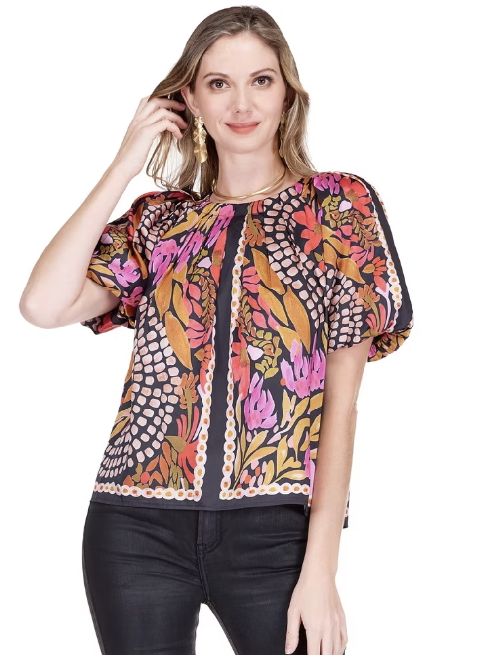 Jade Paved Petals Pleated Puff Sleeve Top