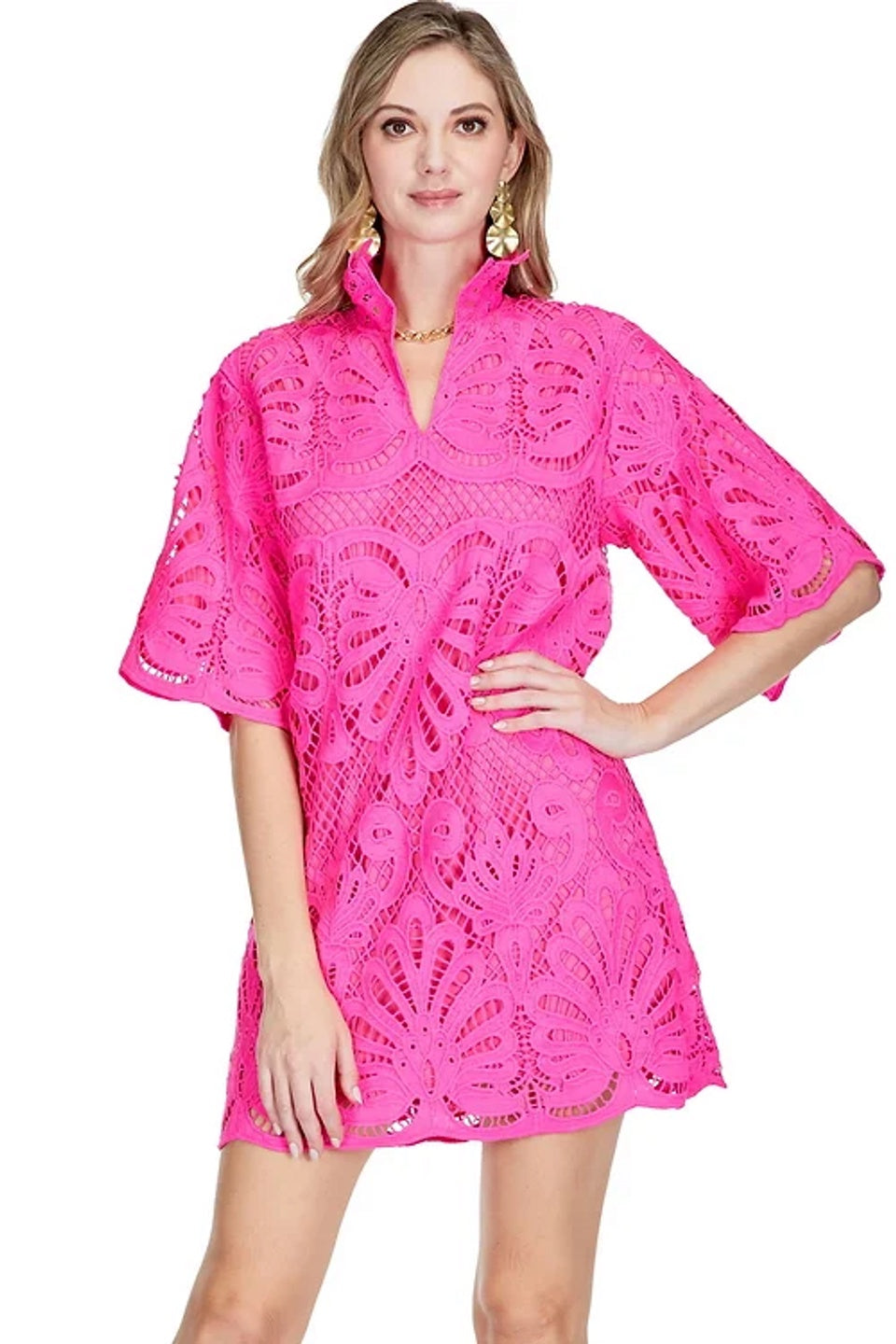 Jade Pink Lace High Neck Short Sleeve Tunic Dress