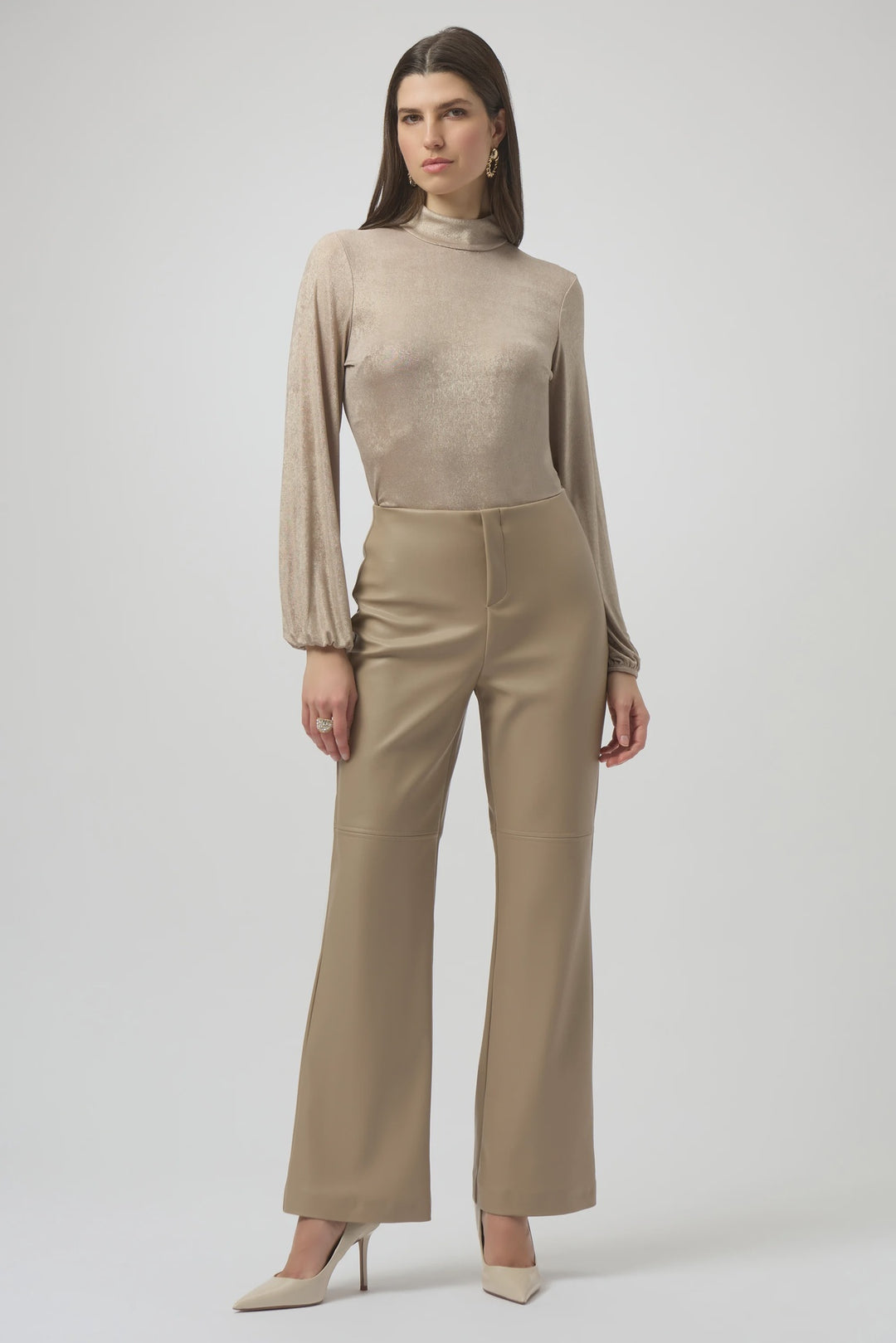 Joseph Ribkoff Foiled Knit Mock Neck Fitted Top- Beige/Gold