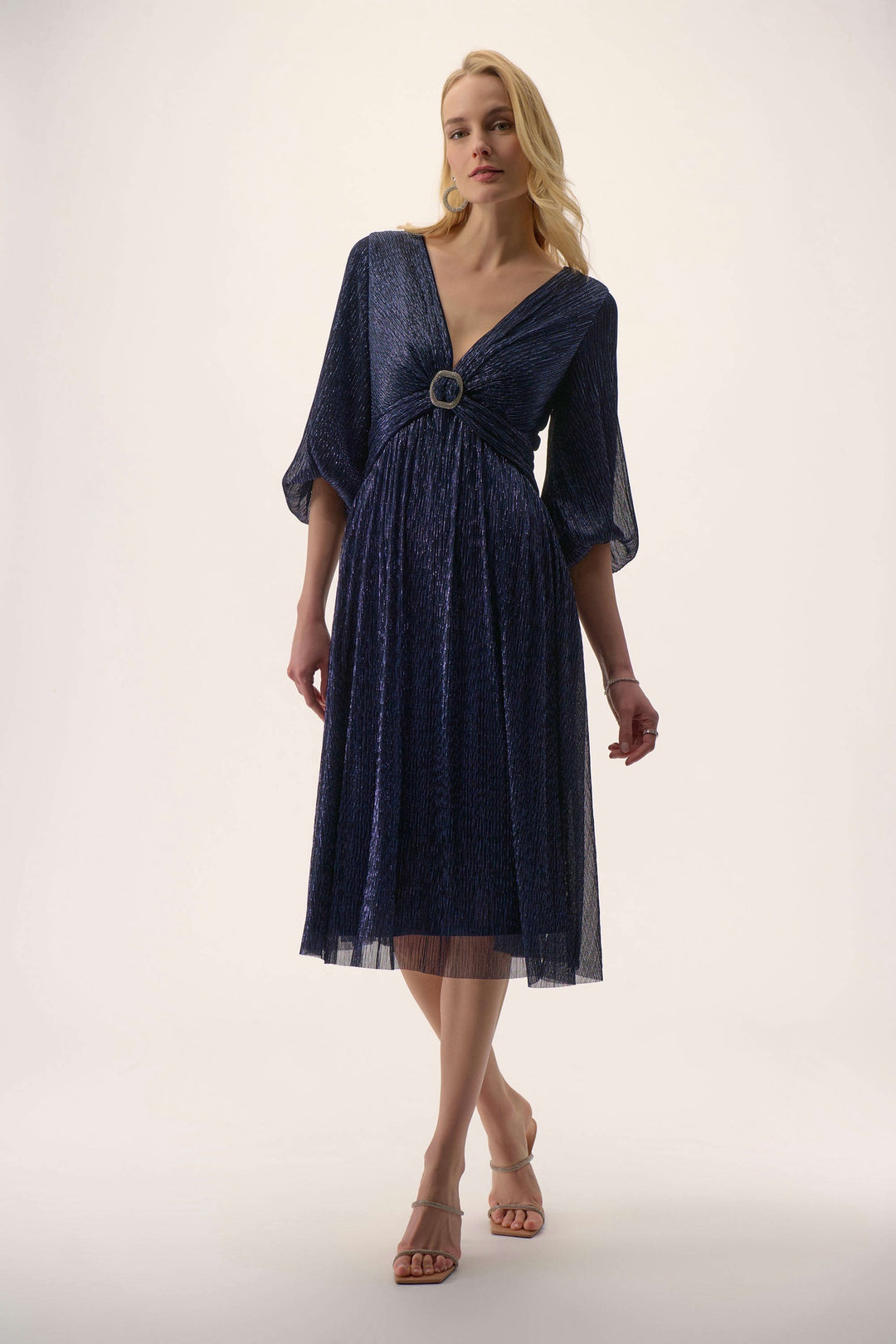 Joseph Ribkoff Signature | Sparkle Mesh Plissé Fit and Flare Midi Dress- Navy