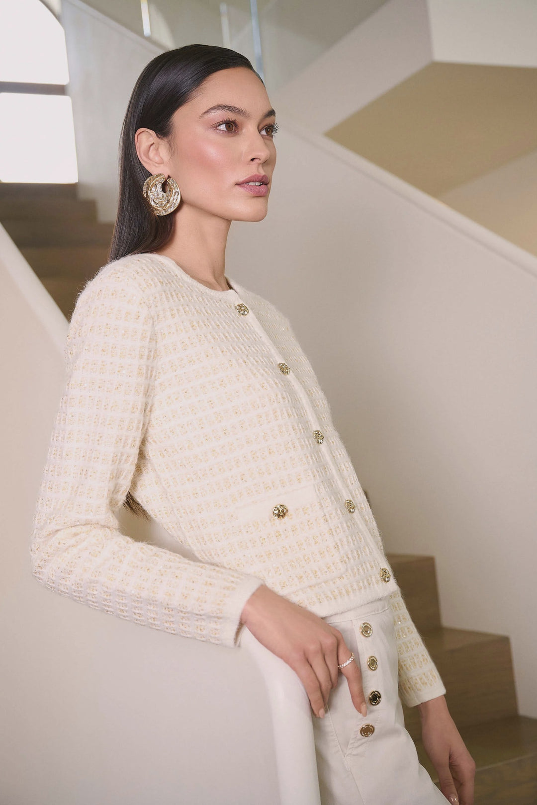 Joseph Ribkoff Sequined Sweater Knit Cardigan with Gold Buttons- Winter White/ Gold