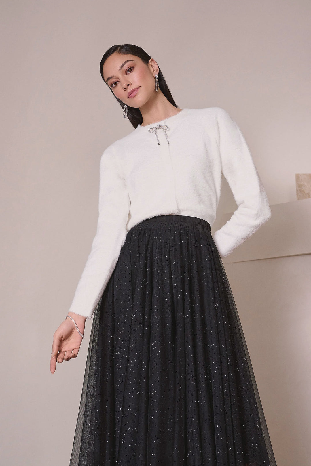 Joseph Ribkoff Feather Yarn Cardigan with Rhinestone Bow- Winter White