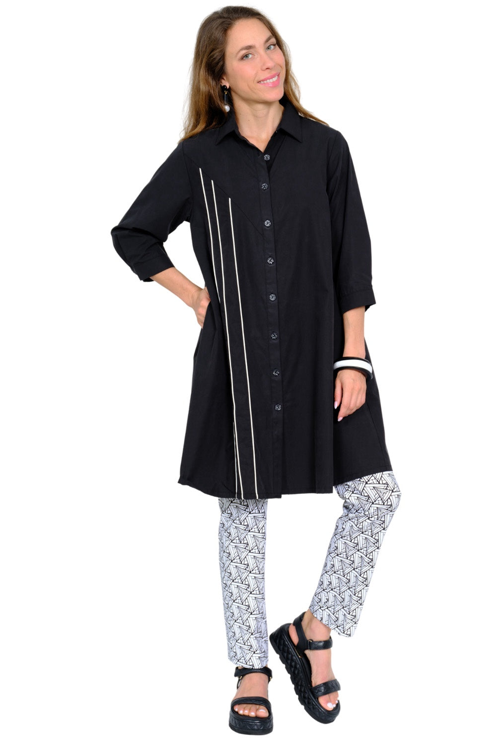 Lior Cherry 3/4 Sleeve Button Down Dress- Black