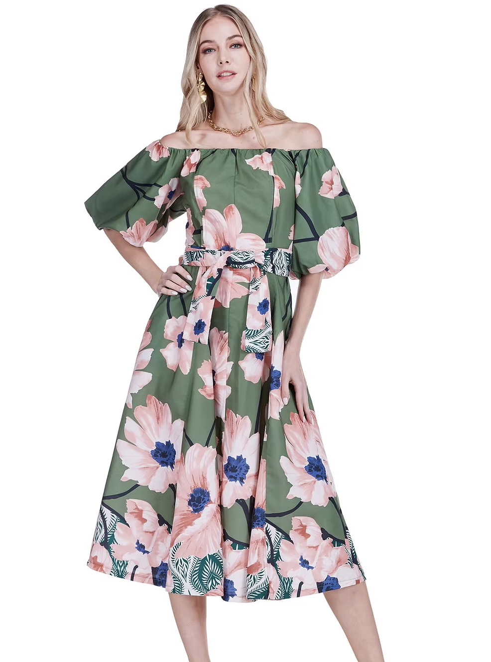 Jade Olive Bloom Off-Shoulder Flared Midi Dress