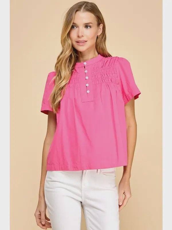 TCEC Front and Back Smocked Detail Half Button Blouse- Pink