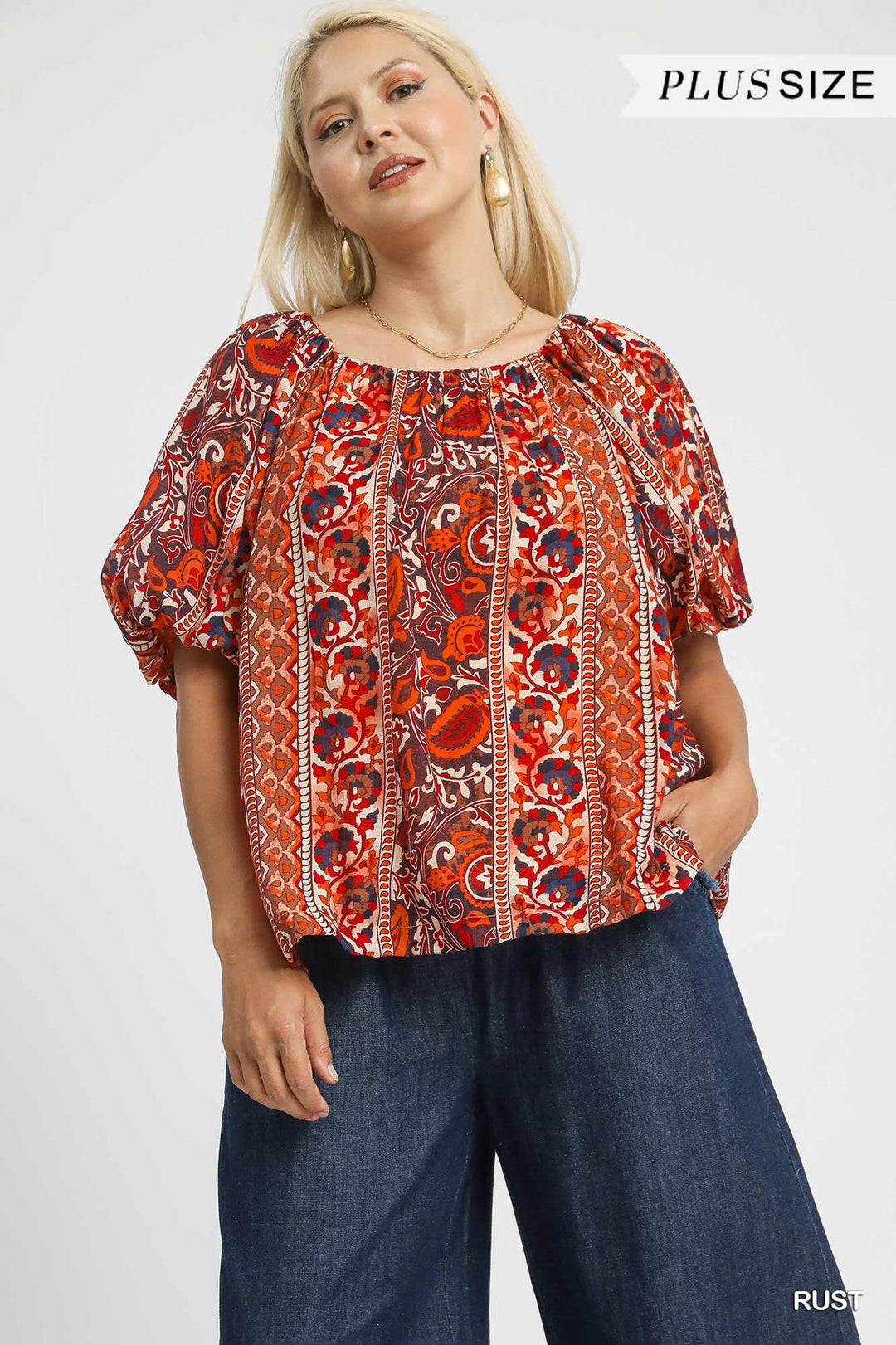 Umgee Plus Size Rust Boho Floral Stripe Puff Sleeve Blouse