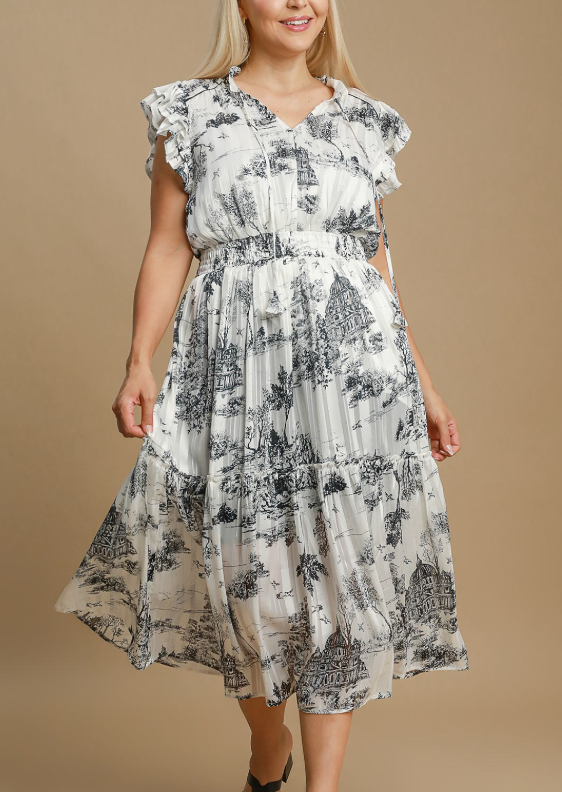 Umgee Black Mix Two Tone Landscape Print Midi Dress