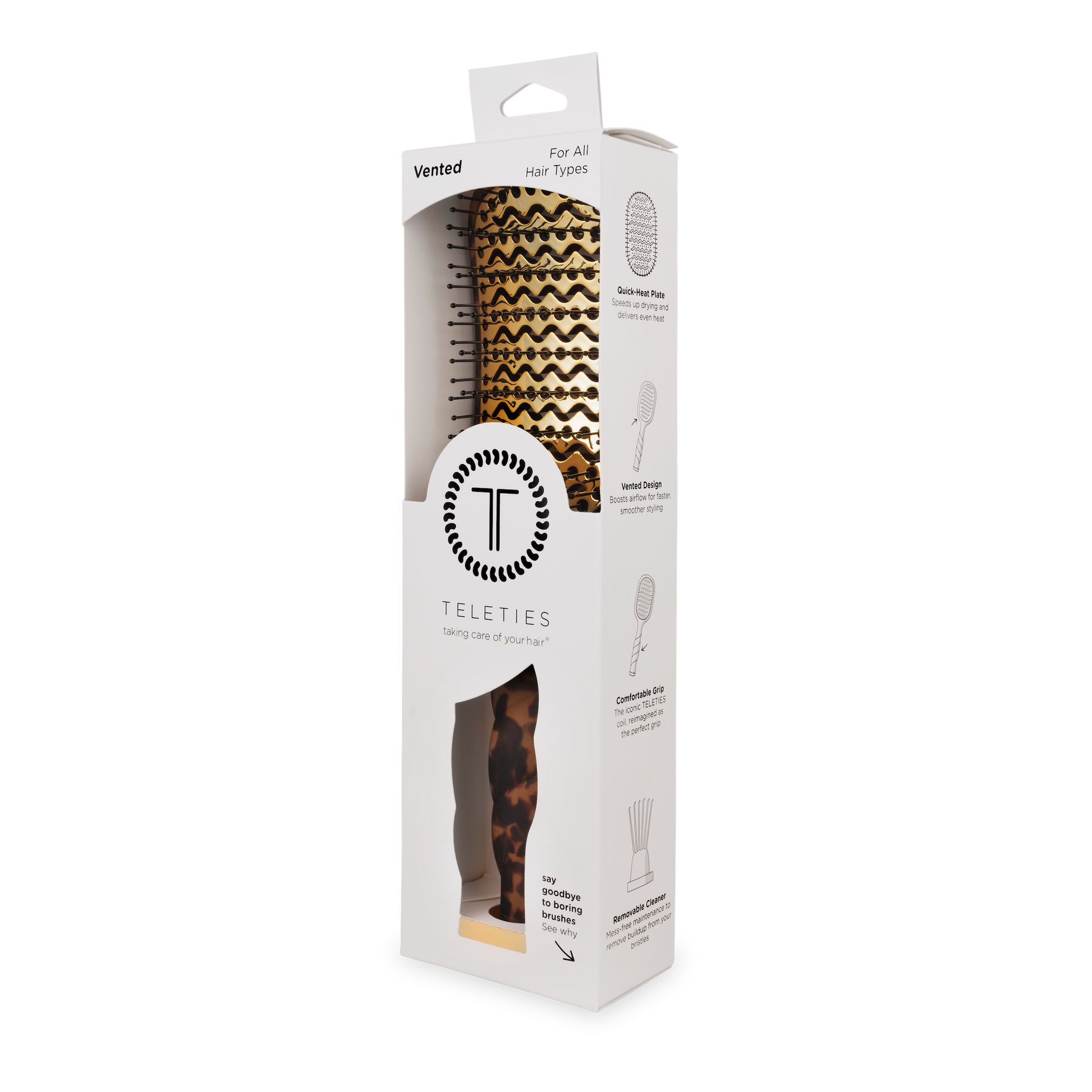 The Vented Brush in Tortoise is your new secret to faster, smoother blowouts. Pairing a Quick-Heat Aluminum Plate that heats up in seconds and distributes heat evenly with a vented design to enhance air flow, this vent brush works perfectly with your blow dryer to cut down on styling time without cutting corners on results.