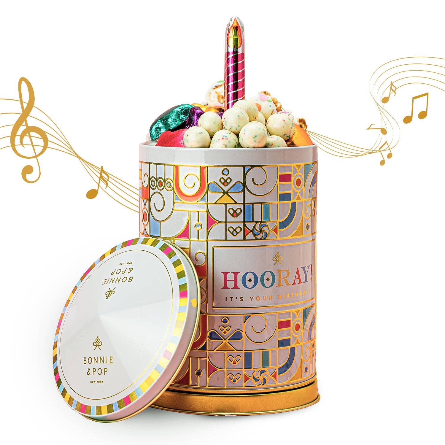 Musical birthday tin filled with sweets and snacks for a very special, very happy birthday surprise! Rotates and sings 'Happy Birthday'.