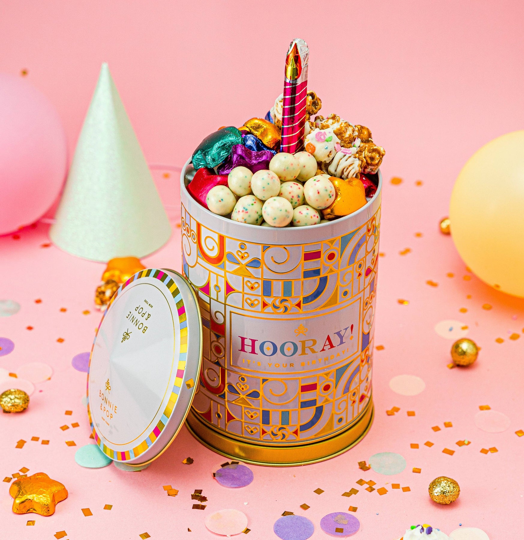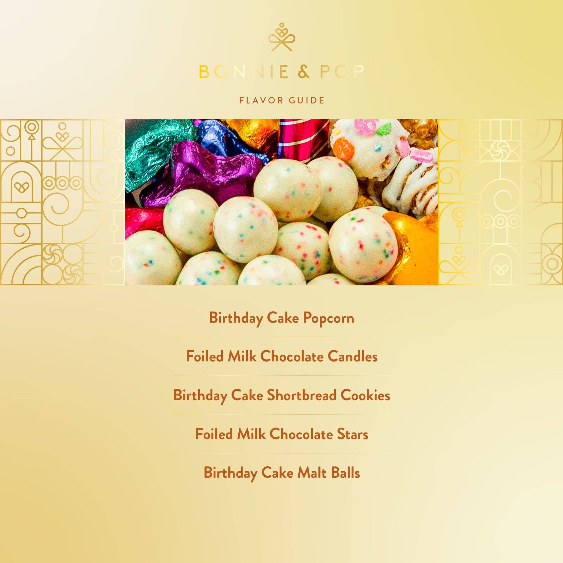 Foiled Chocolate Stars, Birthday Cake Malt Balls, Birthday Cake Popcorn, Chocolate Candles, and Mini Birthday Cake Shortbread Cookies.