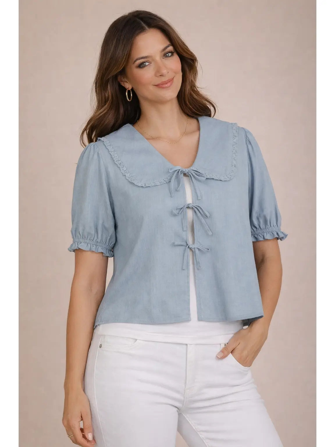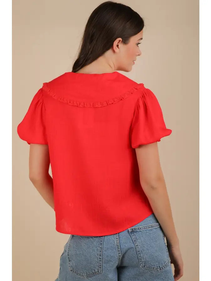 Elevate your wardrobe with this charming short-sleeve top, crafted from a lightweight blend of 75% rayon and 25% linen. The ruffle trim and embroidered eyelet add a playful touch, while the Peter pan collar and tie front offer a cute, casual flair. Perfect for warm days, it promises comfort and style.