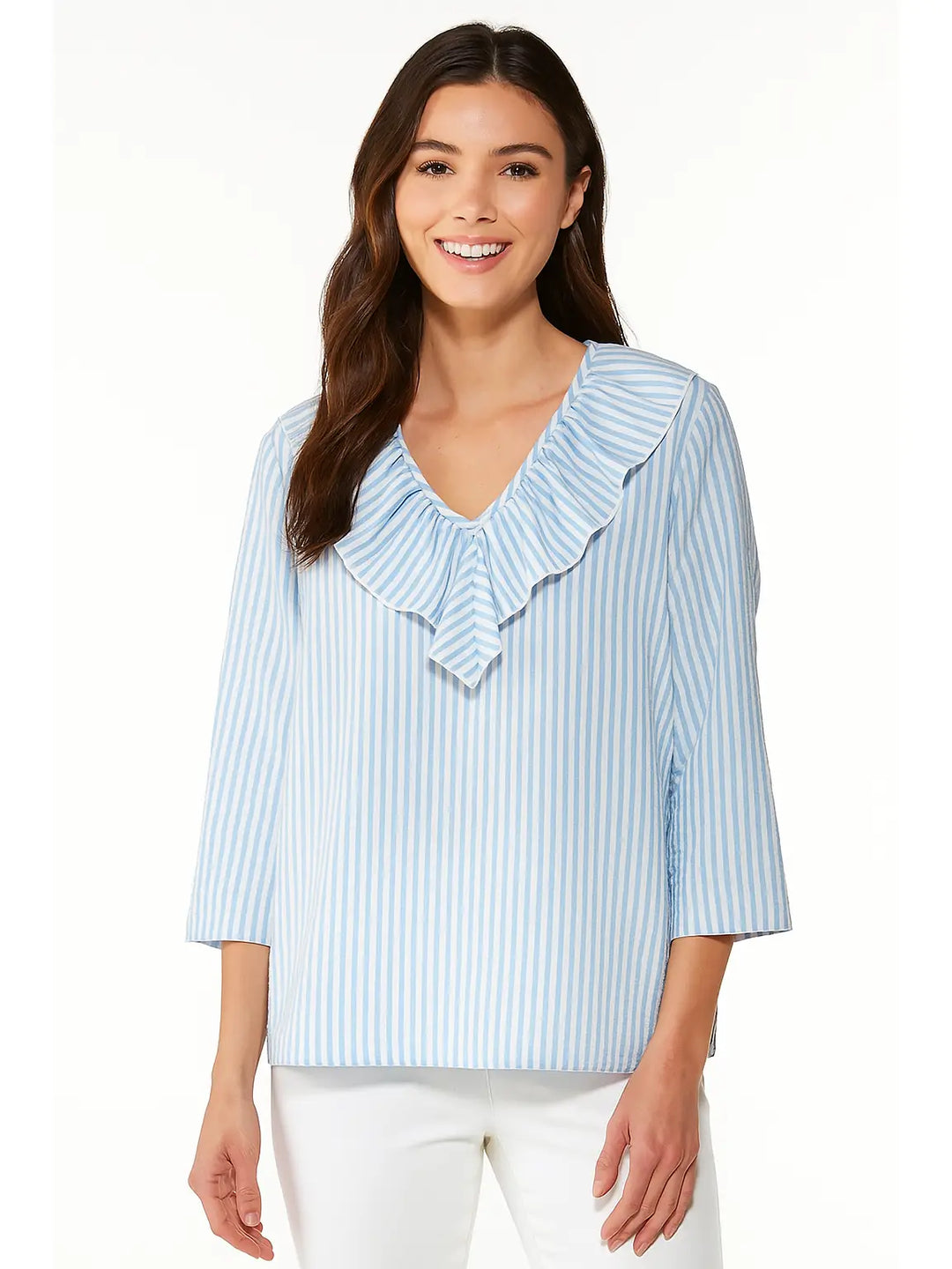 Pine Apparel Striped Linen Ruffle Neck Blouse