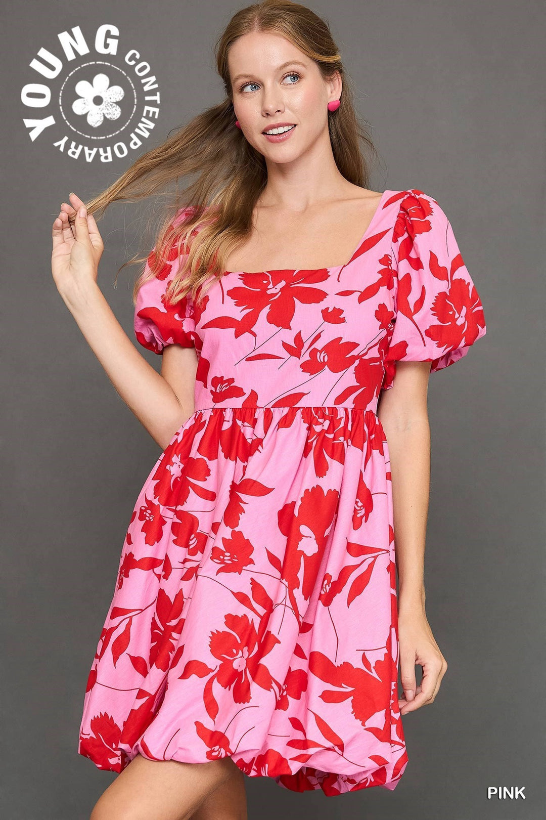 Umgee Pink Two Tone Floral Print Babydoll Dress