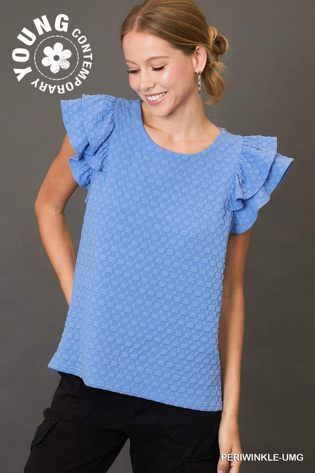 Umgee Periwinkle Blue Textured Jacquard Top with Short Ruffled Sleeves