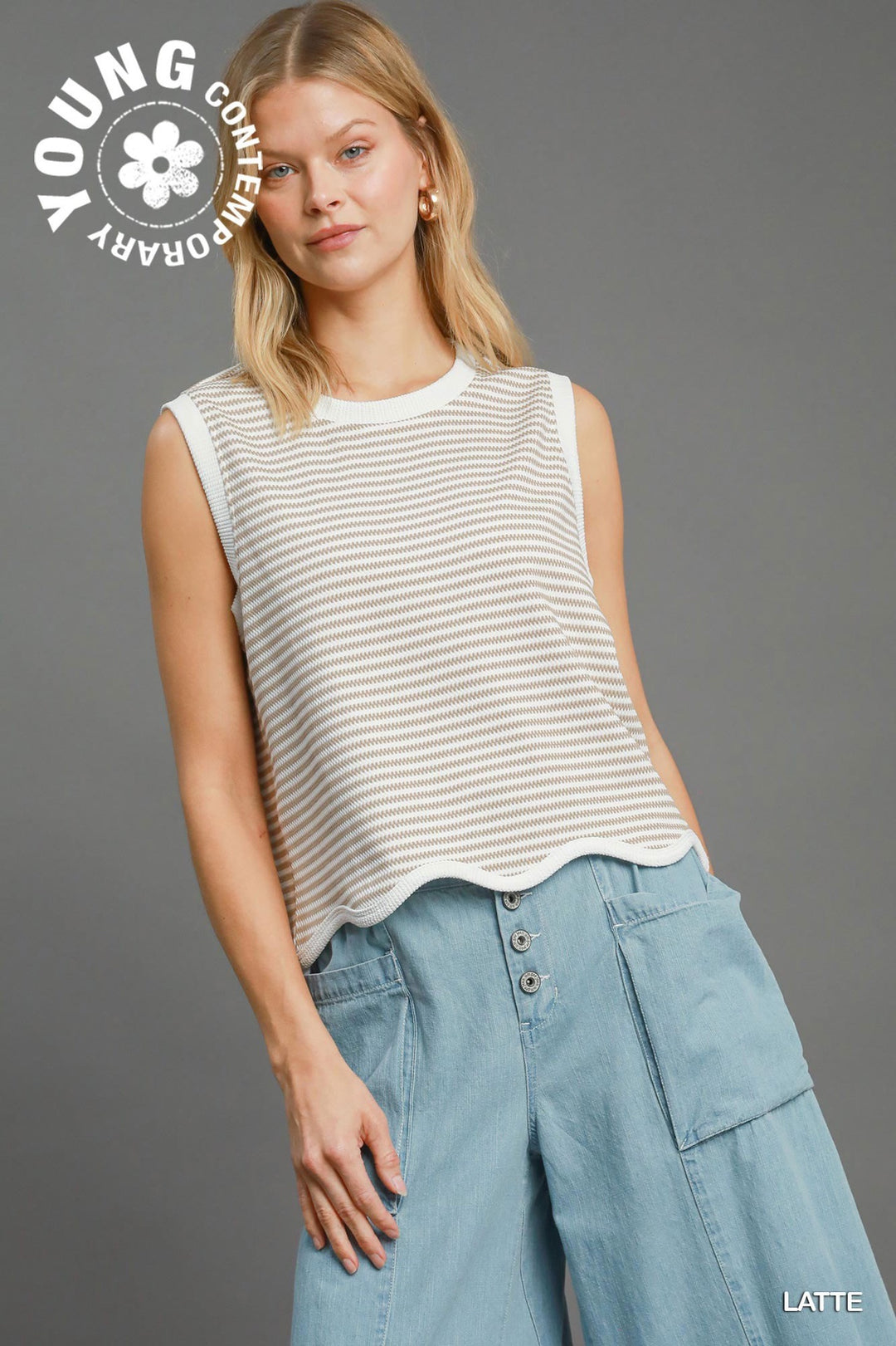 Umgee Latte Textured Knit Top with Scalloped Hemline