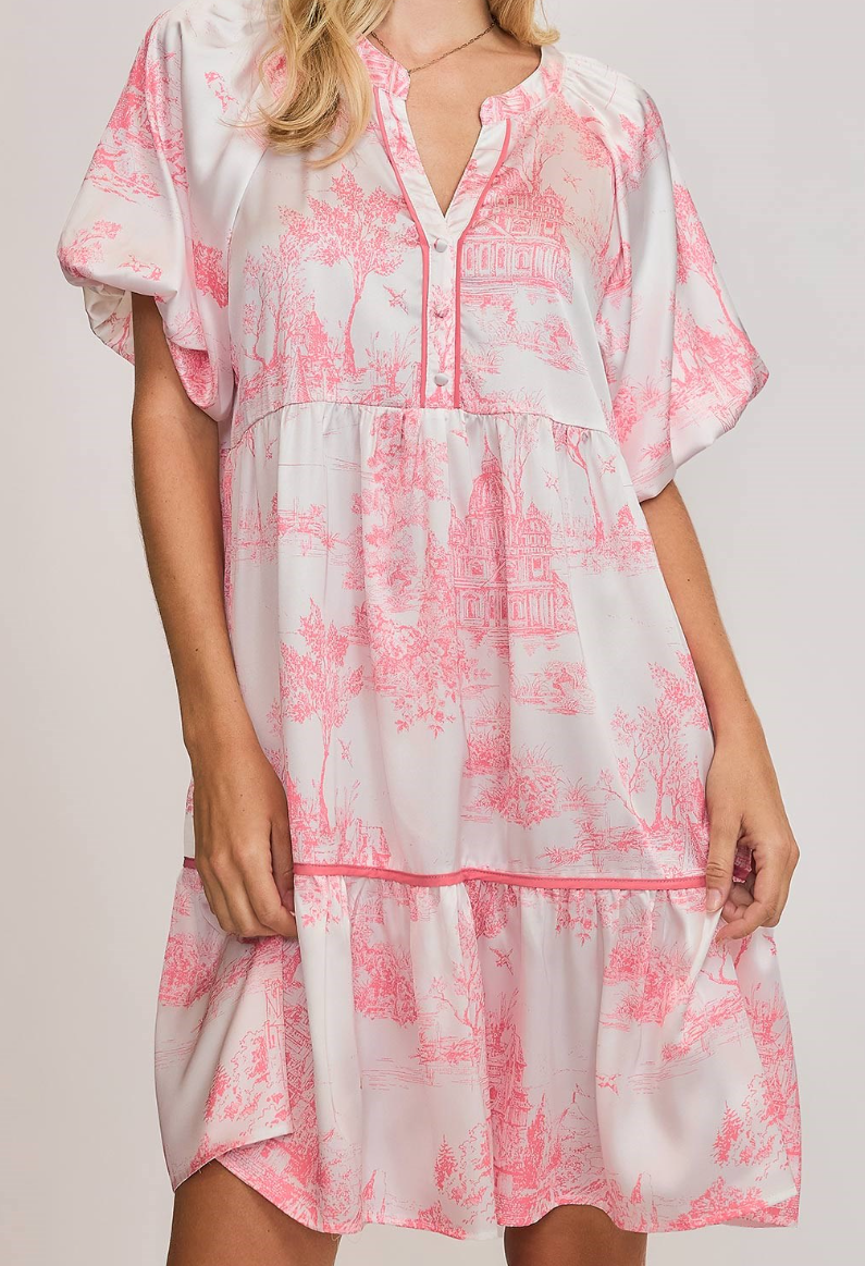 Umgee Two Tone Landscape Print Dress Coral Pink