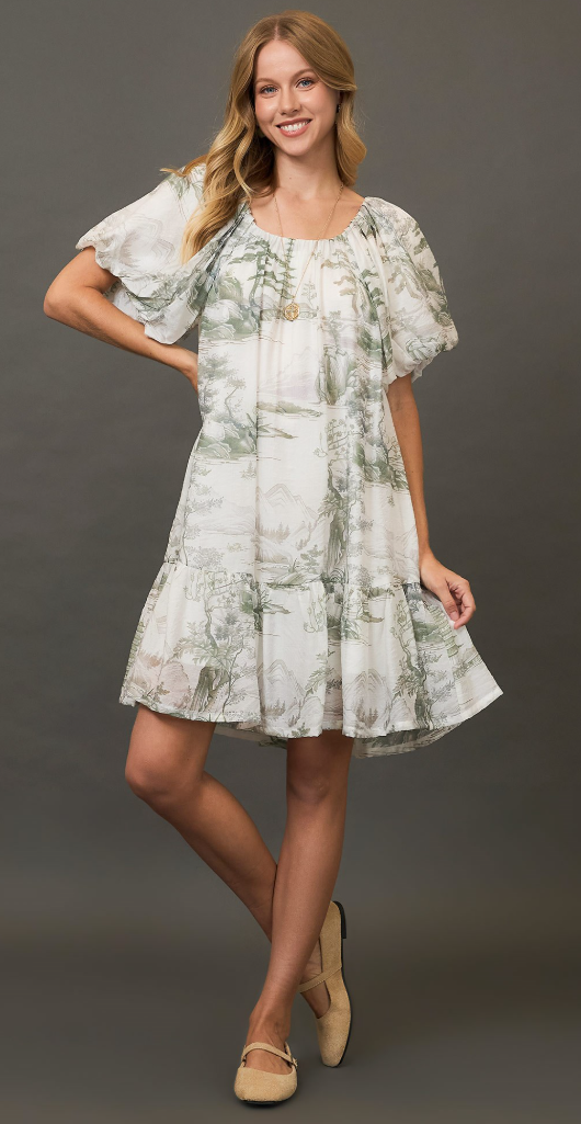 Umgee Toile Print Dress with Puff Sleeves Sage