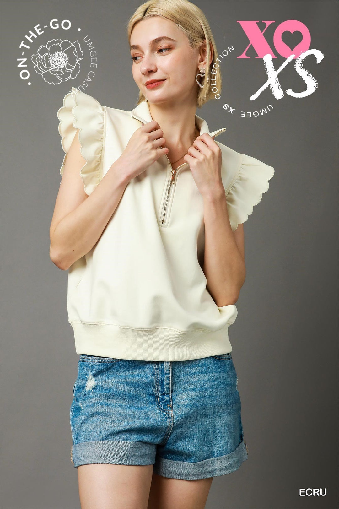 Umgee Ecru Ruffled Zip-Up Sweatshirt