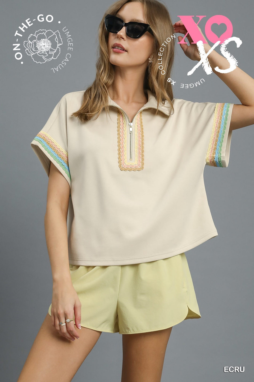 Umgee Ecru Luxeknit Half-Zip Boxy Top with Rainbow Trim